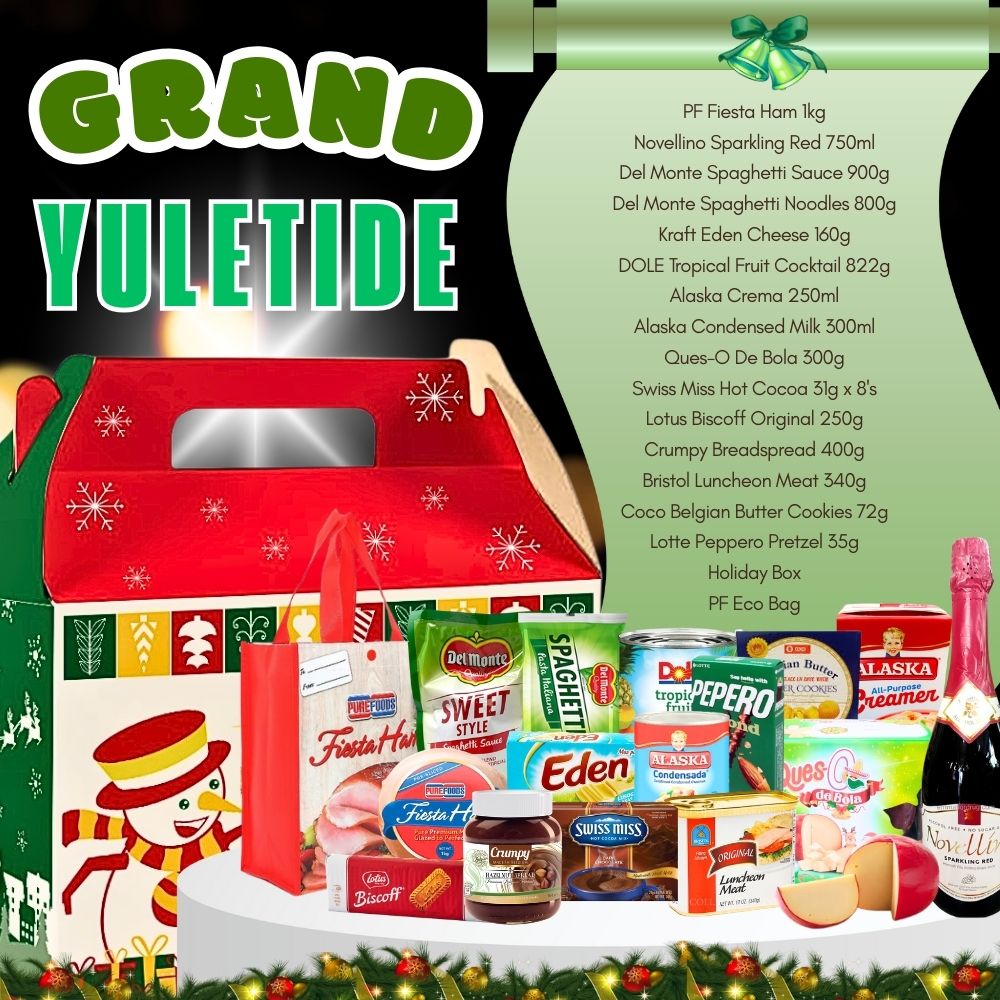 Make Christmas truly grand with the Grand Yuletide Box, featuring a Premium Holiday Ham and a generous selection of festive grocery favorites—crafted to bring joy, abundance, and the spirit of giving to every Noche Buena table.