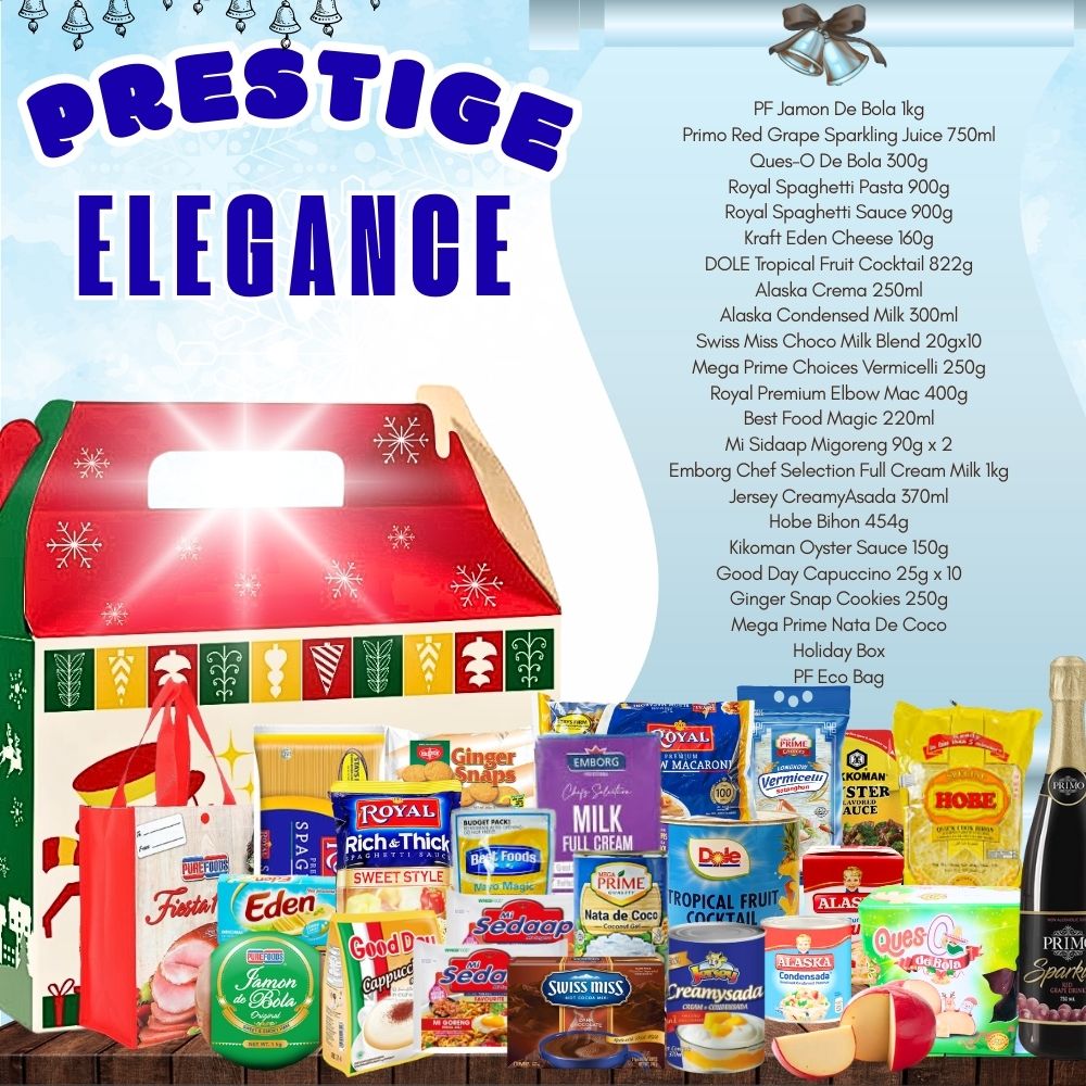 Celebrate the season in style with the Prestige Elegance Box, a premium selection of holiday groceries highlighted by a Holiday Ham, curated for a truly elegant and memorable Noche Buena feast.