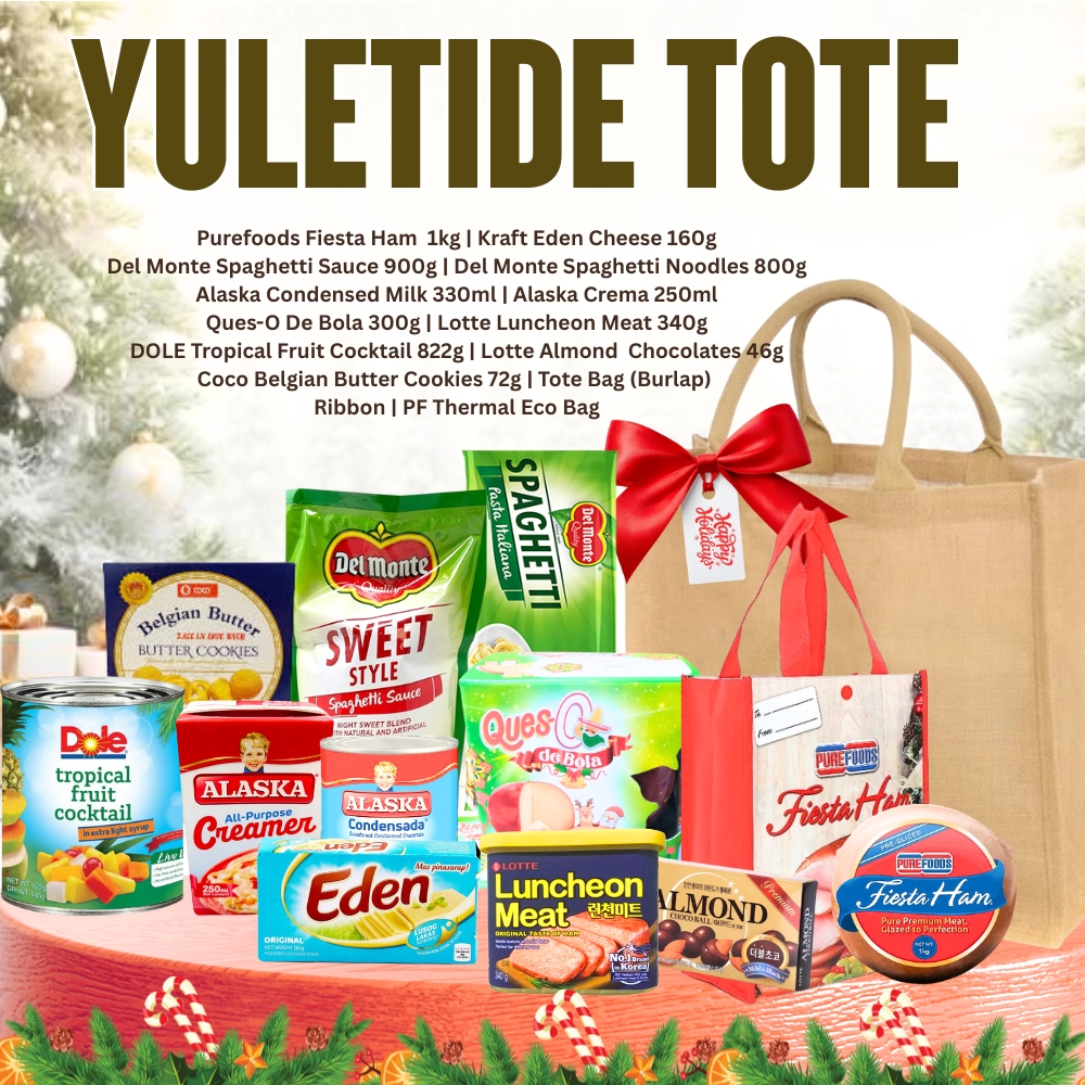 Celebrate the season with the Fiesta Holiday Grocery Tote, a thoughtfully curated Christmas package that brings the spirit of Noche Buena straight to your table. Nestled in a rustic yet elegant burlap tote bag, this holiday bundle features the festive centerpiece — Premium Ham— along with a selection of carefully chosen grocery favorites to complete your Christmas feast.